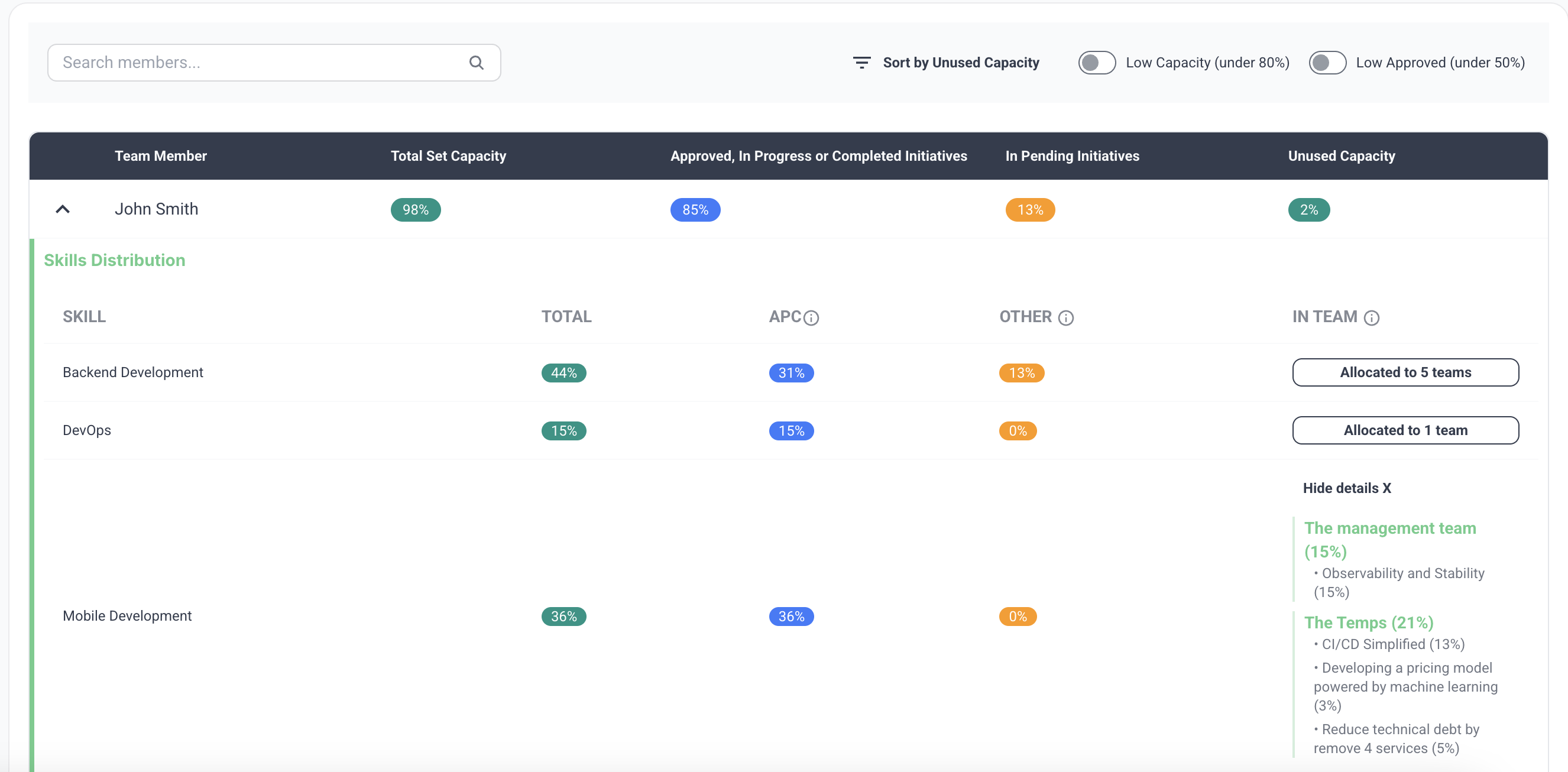 This section provides a consolidated overview of the team members, their skills allocation, and to which teams and which initiatives. There are also two options to check the allocation of capacity and skills: