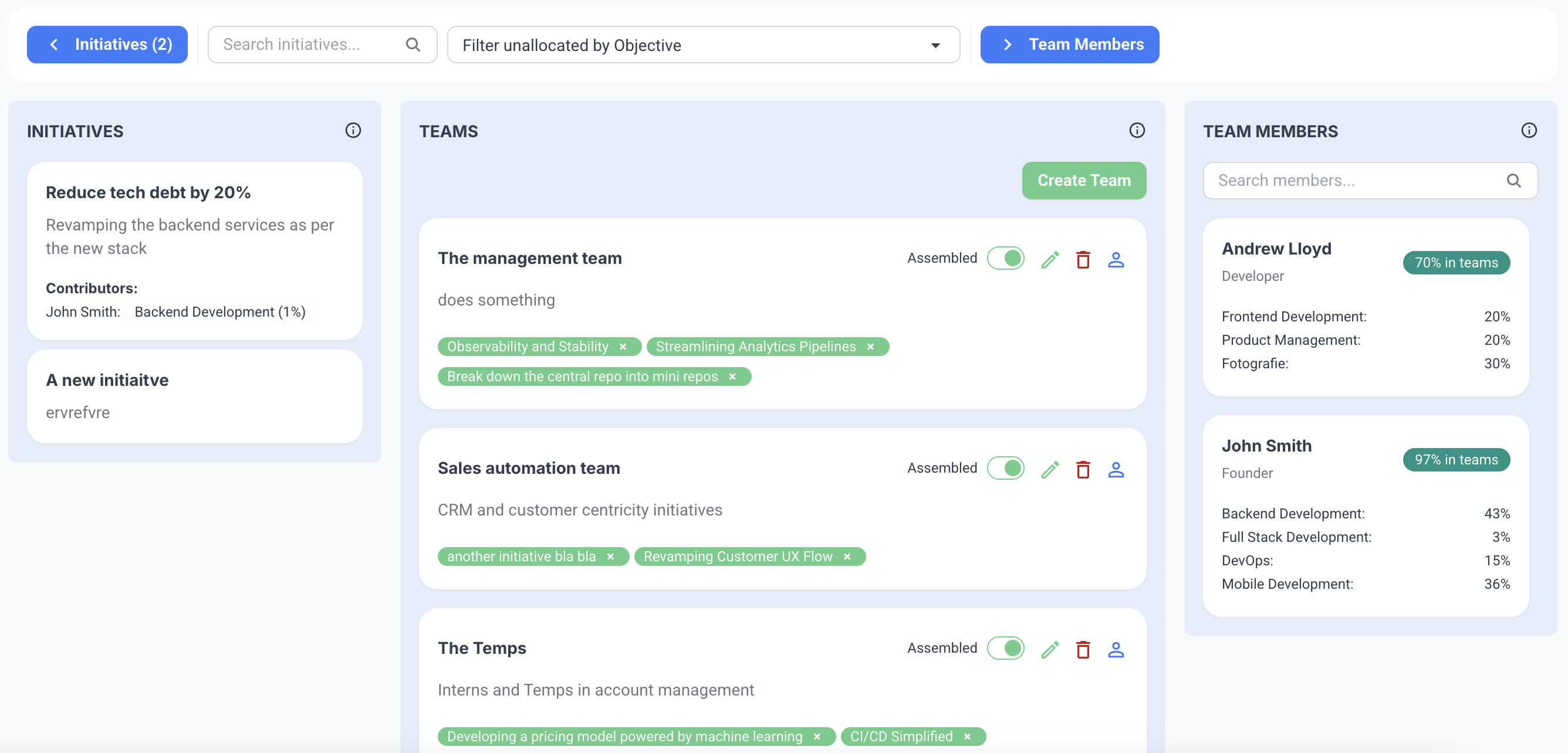 - See how the Initiative distribution looks per each team, which team members are in each team and with what % capacity they contribute.
